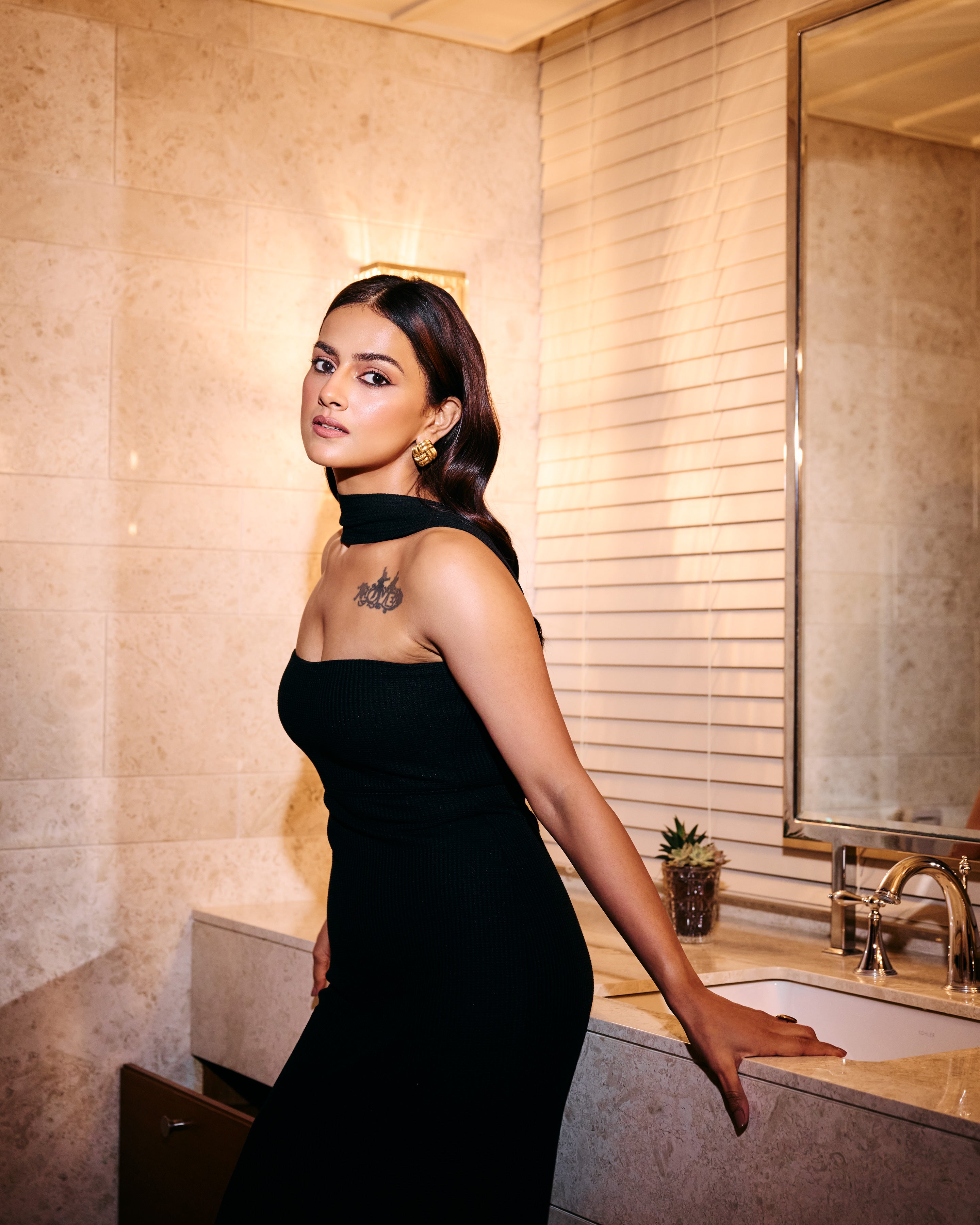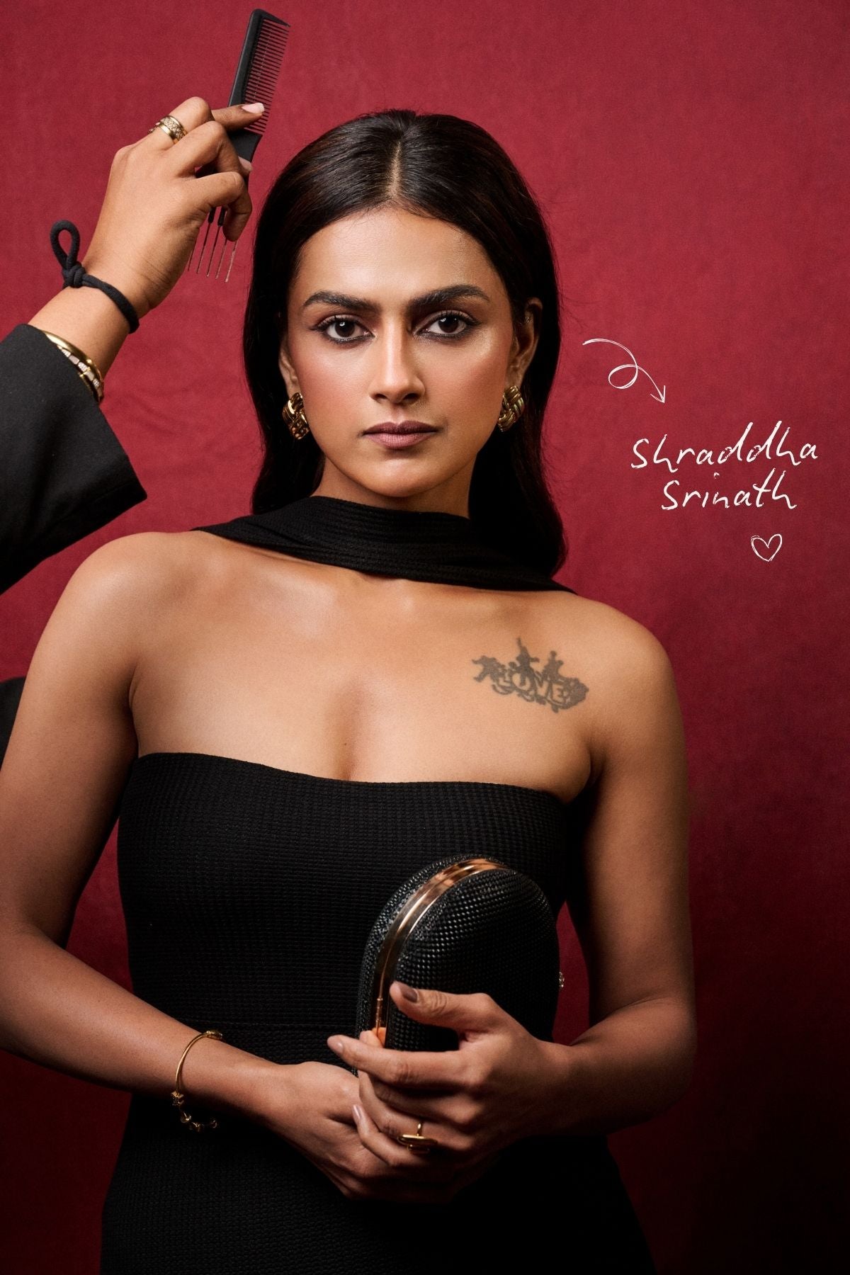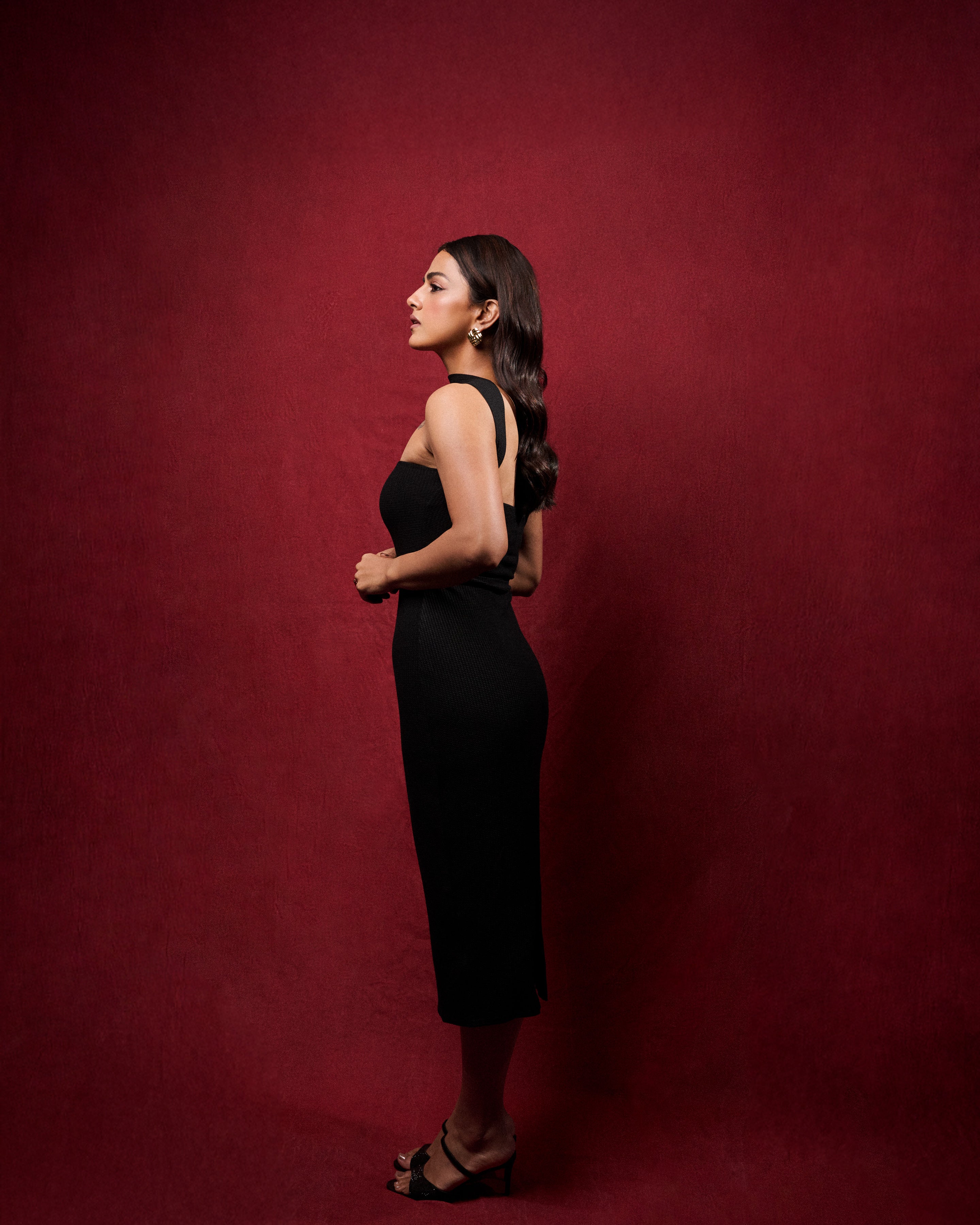 Dahlia Black Maxi Dress with a floral strap detail styled for a city look.
